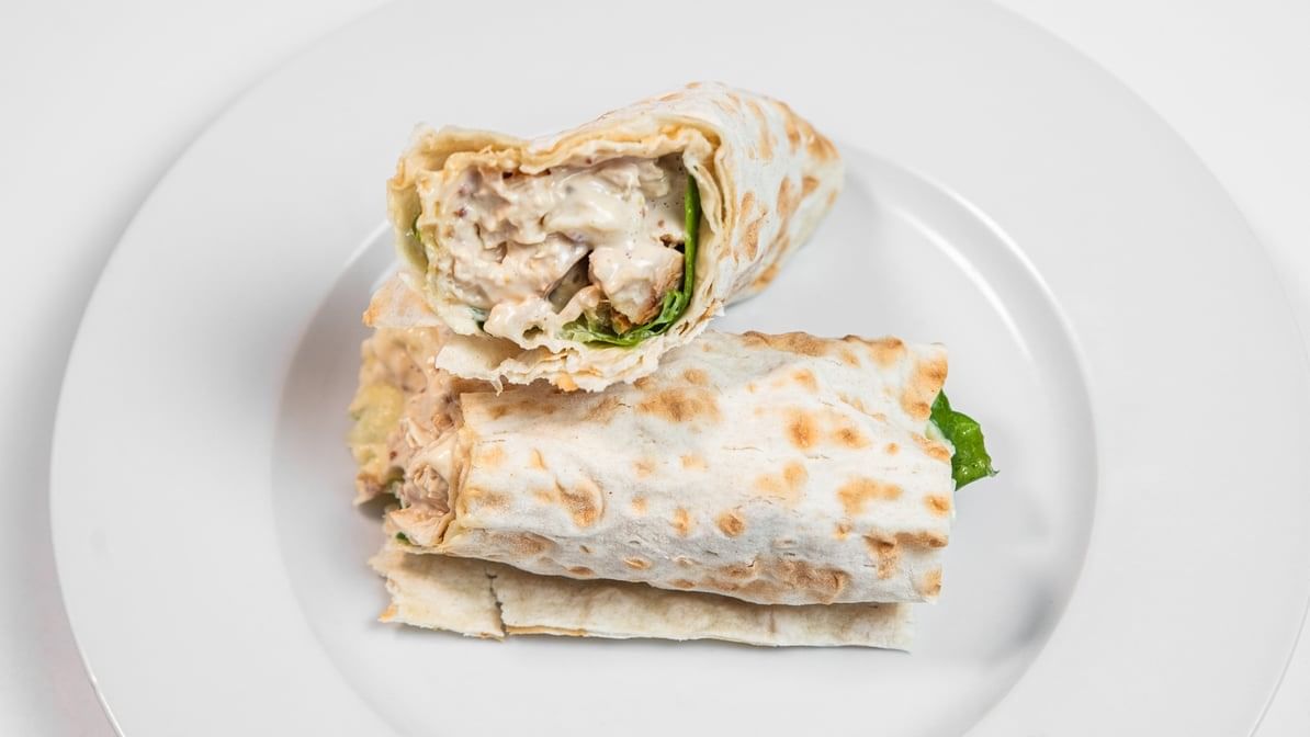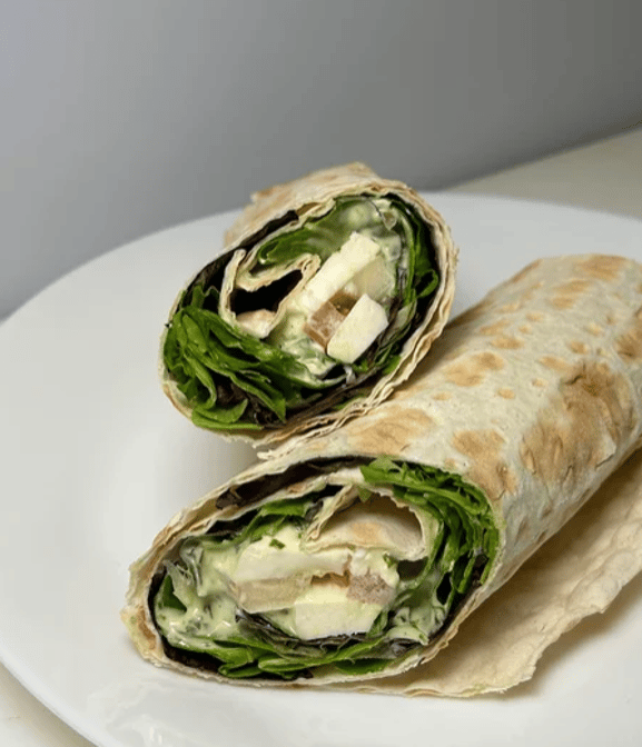 Served with low carb sourdough wrap bread, organic greens and chicken salad