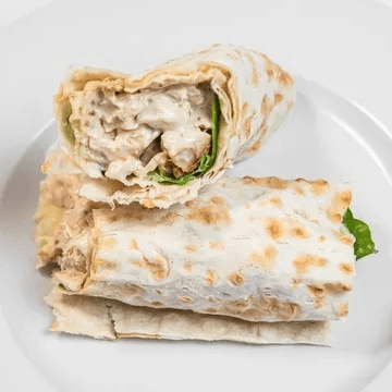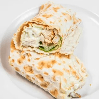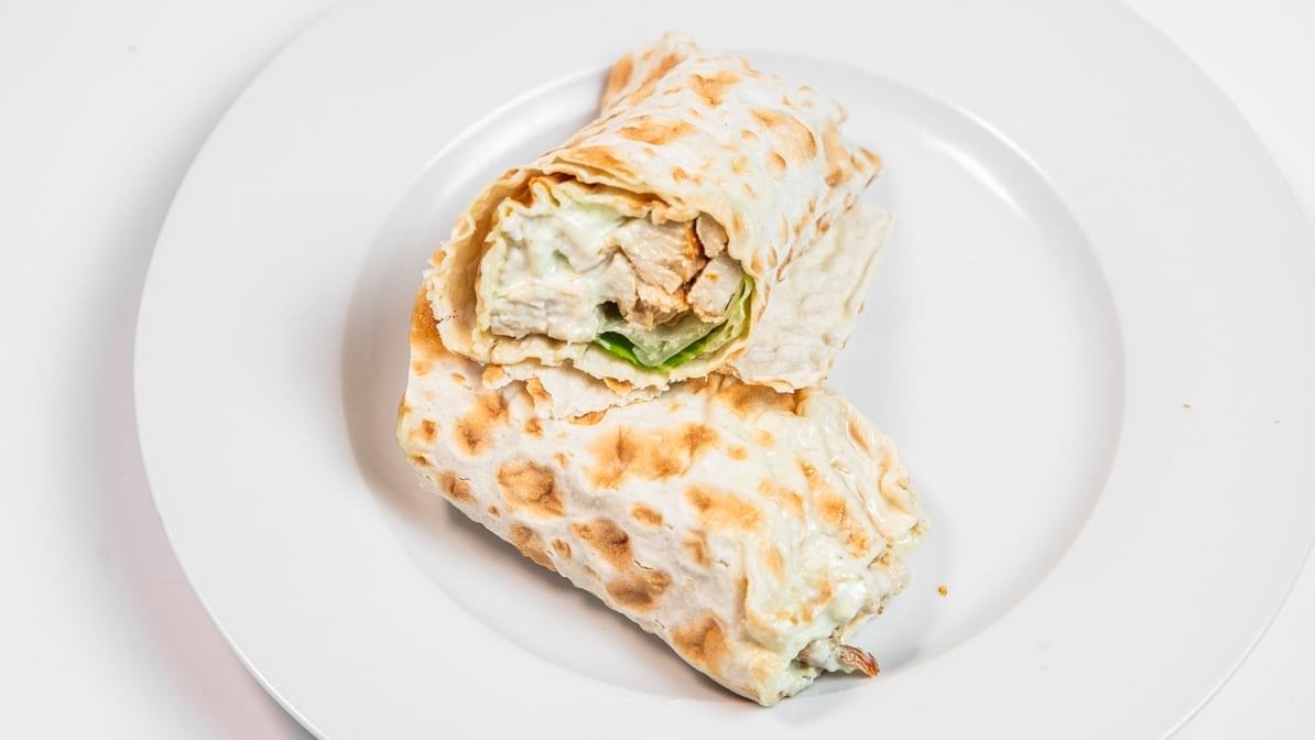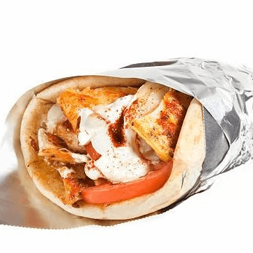 We add chicken and top it with our homemade white sauce (comes with lettuce, tomatoes and onions). Served on pita bread