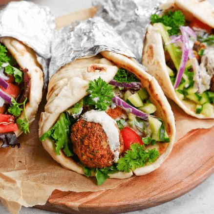 We add falafel and lamb and top it with our homemade white sauce (comes with lettuce, tomatoes and onions). Served on pita bread