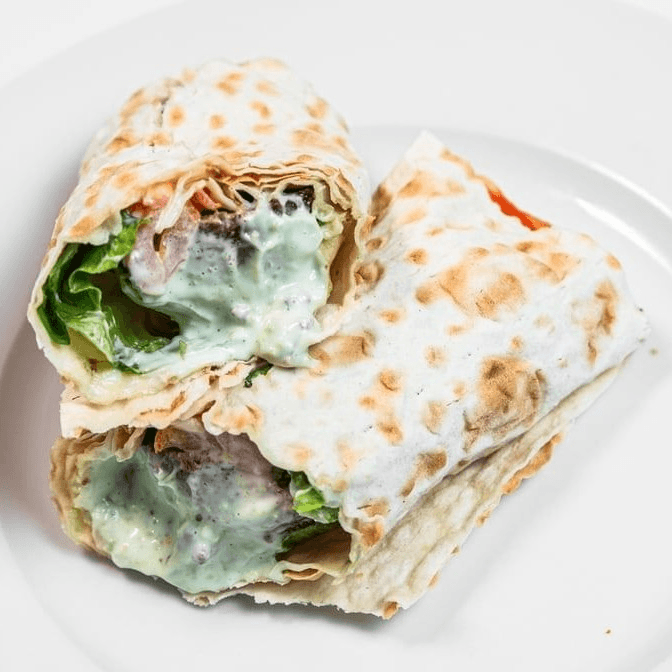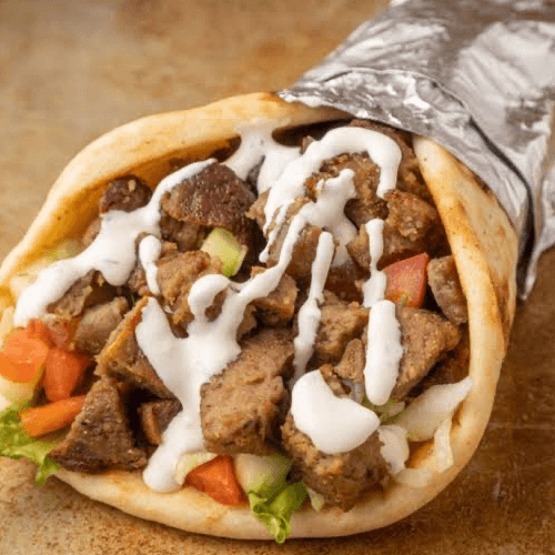 We add lamb and top it with our homemade white sauce (comes with lettuce, tomatoes and onions). Served on pita bread