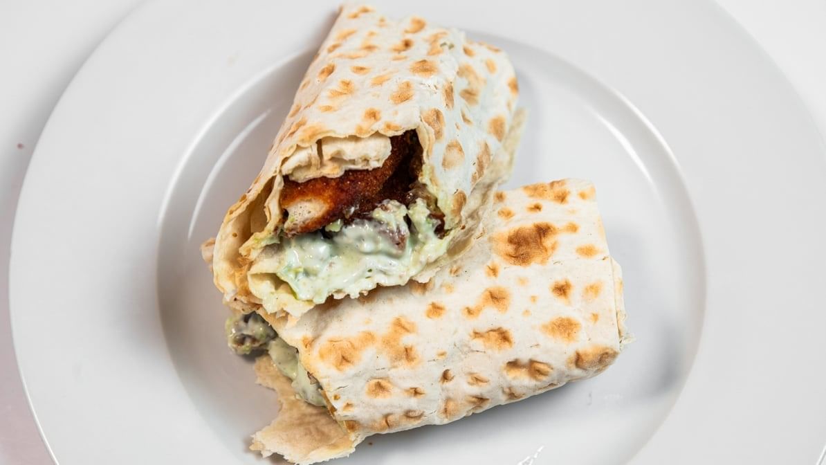 We add chicken and falafel and top it with our homemade white sauce (comes with lettuce, tomatoes and onions). Served on pita bread