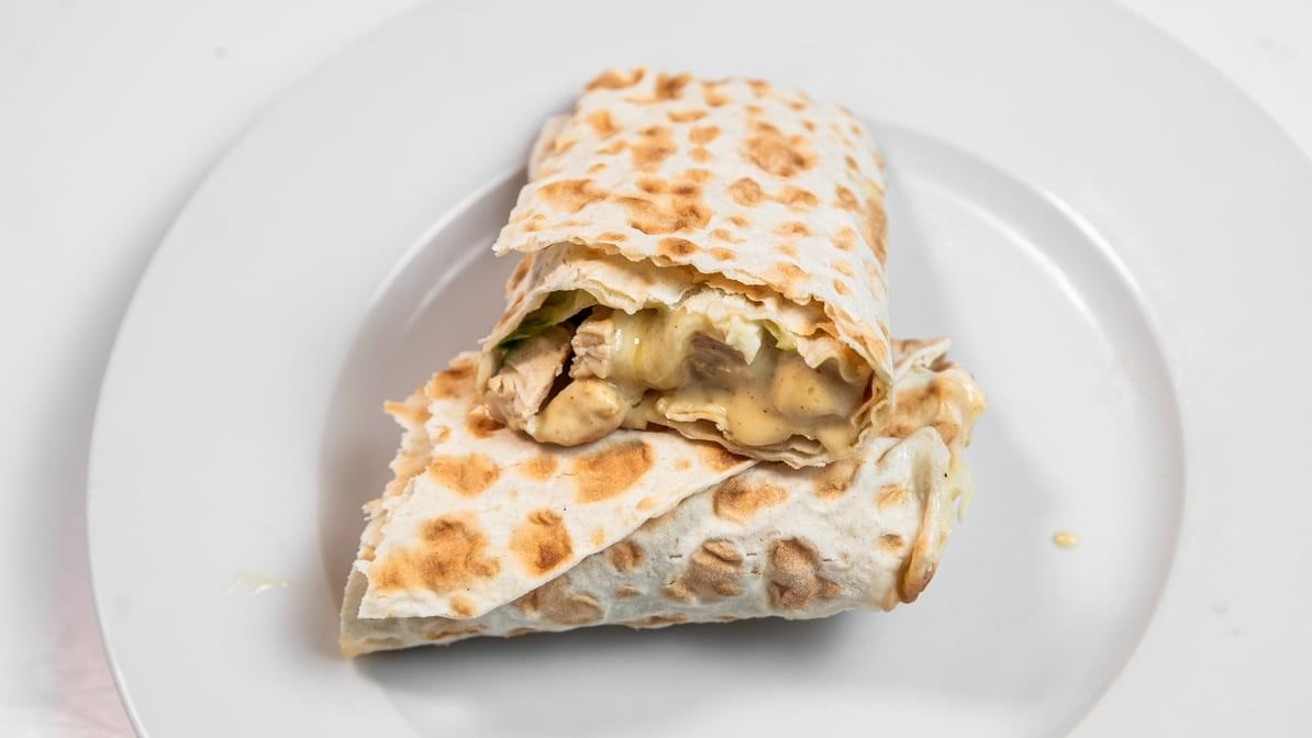 We add chicken, melt American cheese on it, and top it with our homemade white sauce (comes with lettuce, tomatoes and onions). Served on pita bread