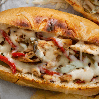 We add chicken, melt American cheese on it, and top it with our homemade European ketchup (includes peppers and onions). Served on hero bread