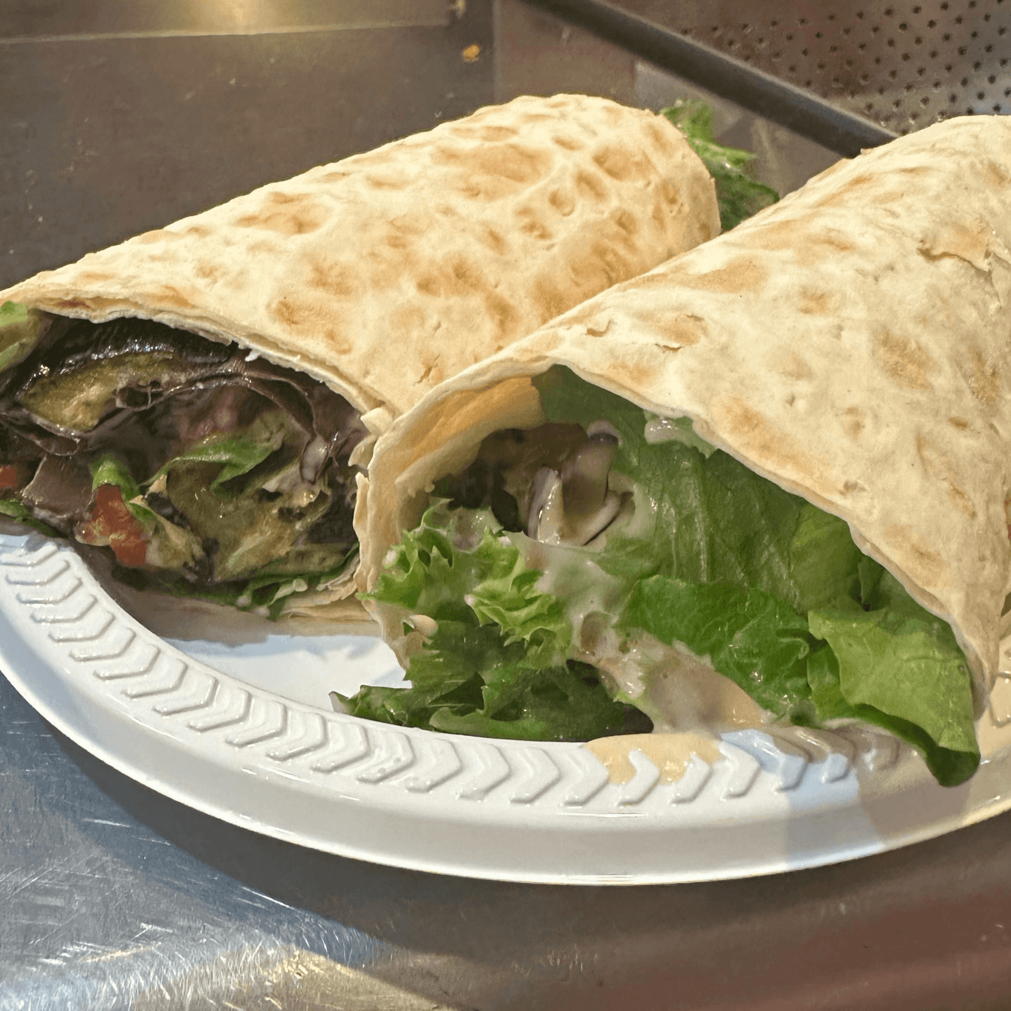 Served with low carb sourdough wrap bread, organic greens, zucchini, roasted peppers, portobella mushrooms and our homemade caesar sauce