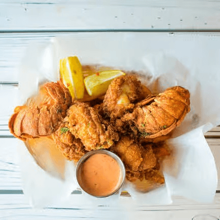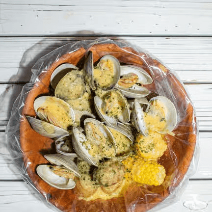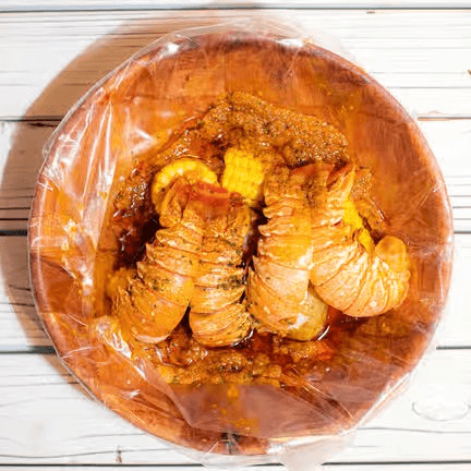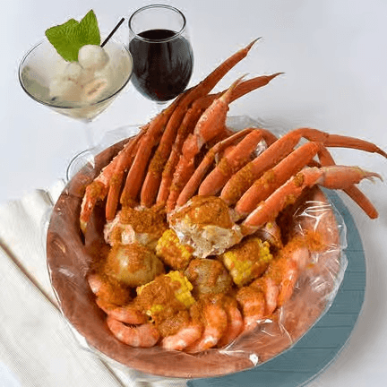 For 5 people or more. Lobster tail (4 pieces) (5 oz), snow crab (2 lb), shrimp (2), mussels (1 b), eggs (6 pieces), corns (8 pieces), potato (8 pieces). Comes with potatoes & corns. Shrimp head off may substitute to mussels, crawfish or clams