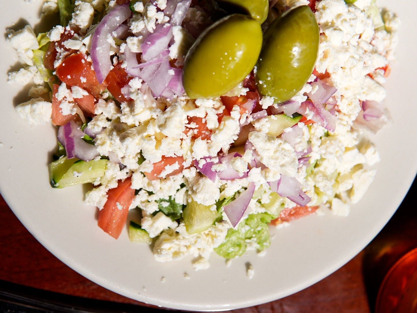 Grilled chicken, lettuce, tomatoes, cucumbers, onions, feta cheese, balsamic dressing
