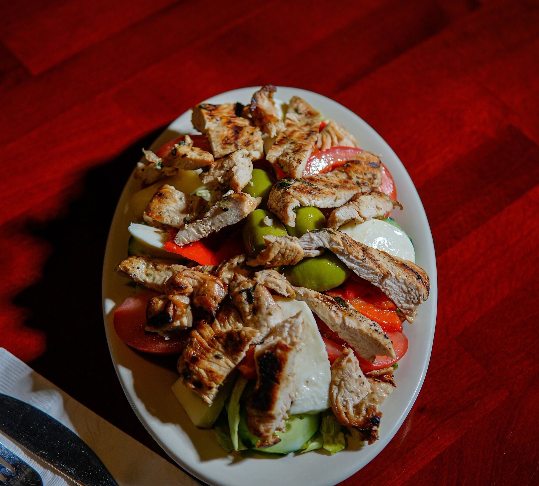 Lettuce, tomato, cucumber, provolone, fresh mozzarella, grilled chicken, and roasted red peppers
