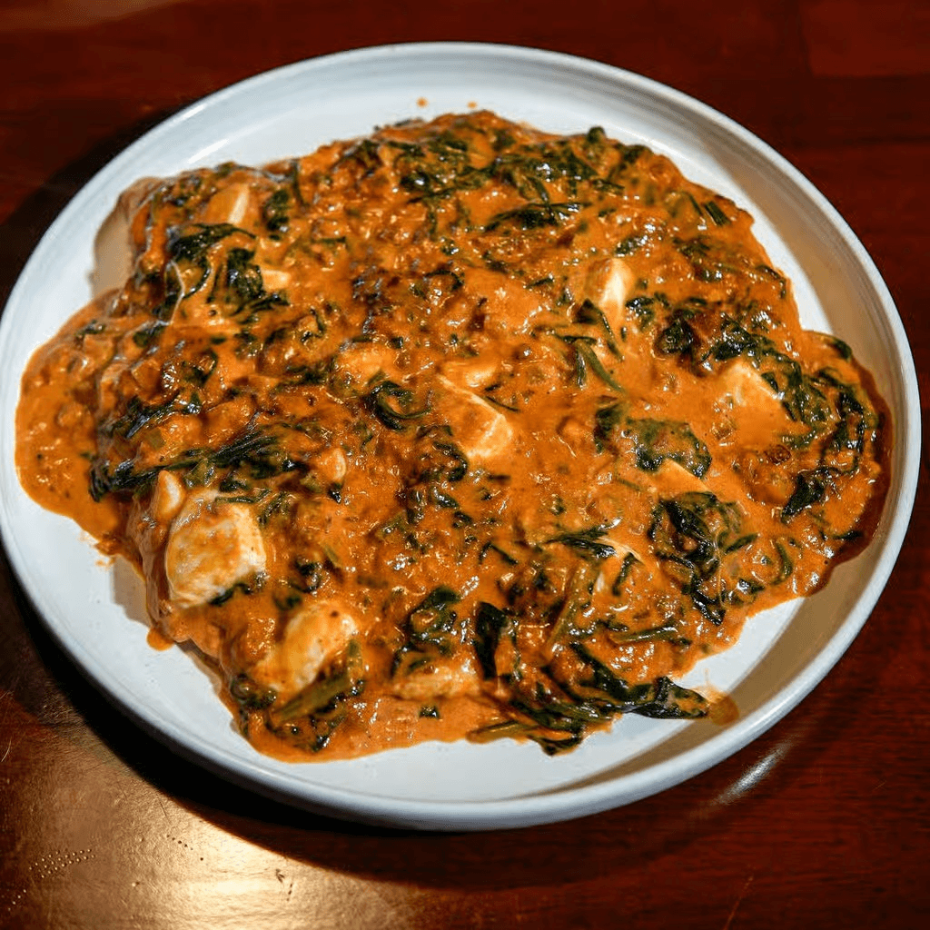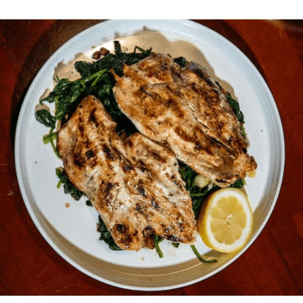 Grilled chicken on a bed of spinach sauteed with garlic and oil