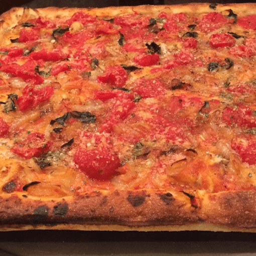 Authentic crunchy Sicilian crust topped with plum tomatoes sauteed onions