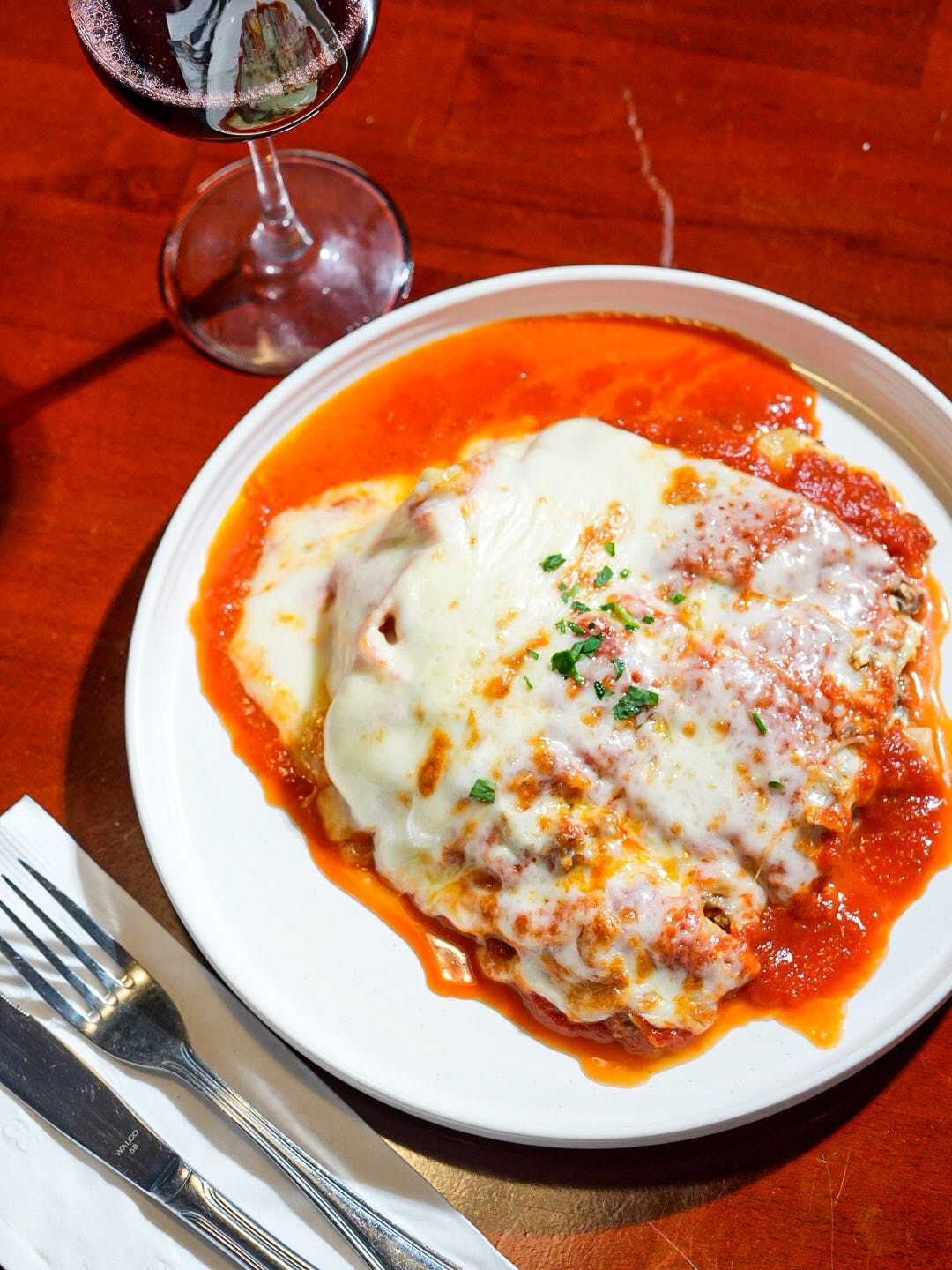 Baked eggplant, tomato sauce, ricotta & mozzarella cheese topped with a sesame crust