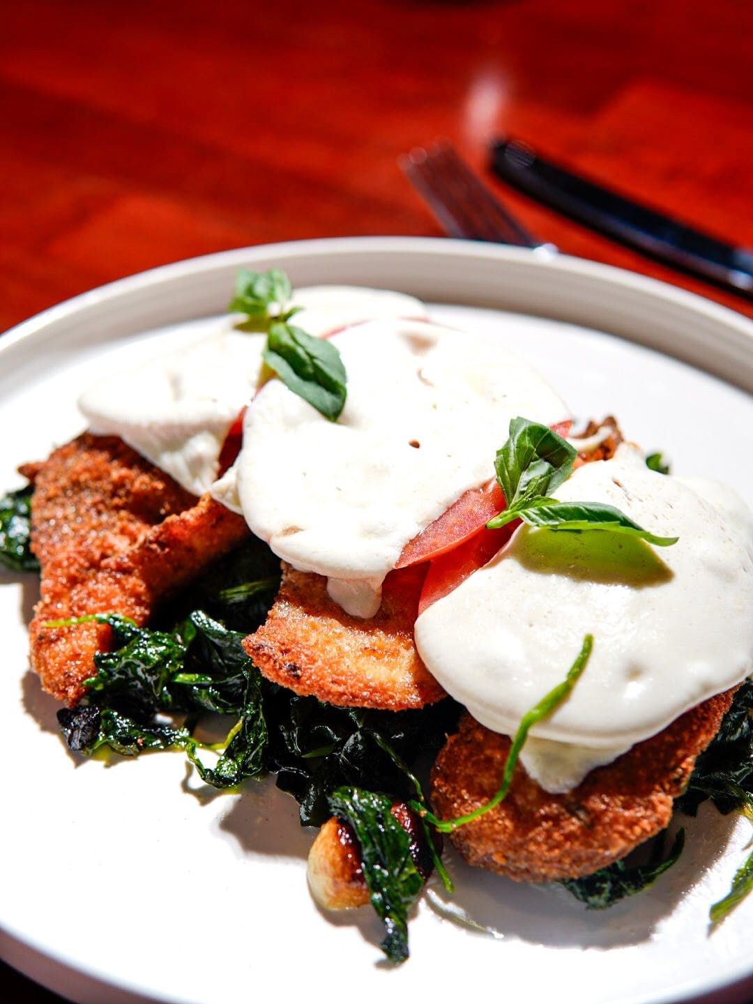 Breaded chicken cutlet with sliced tomatoes & fresh mozzarella over a bed of spinach