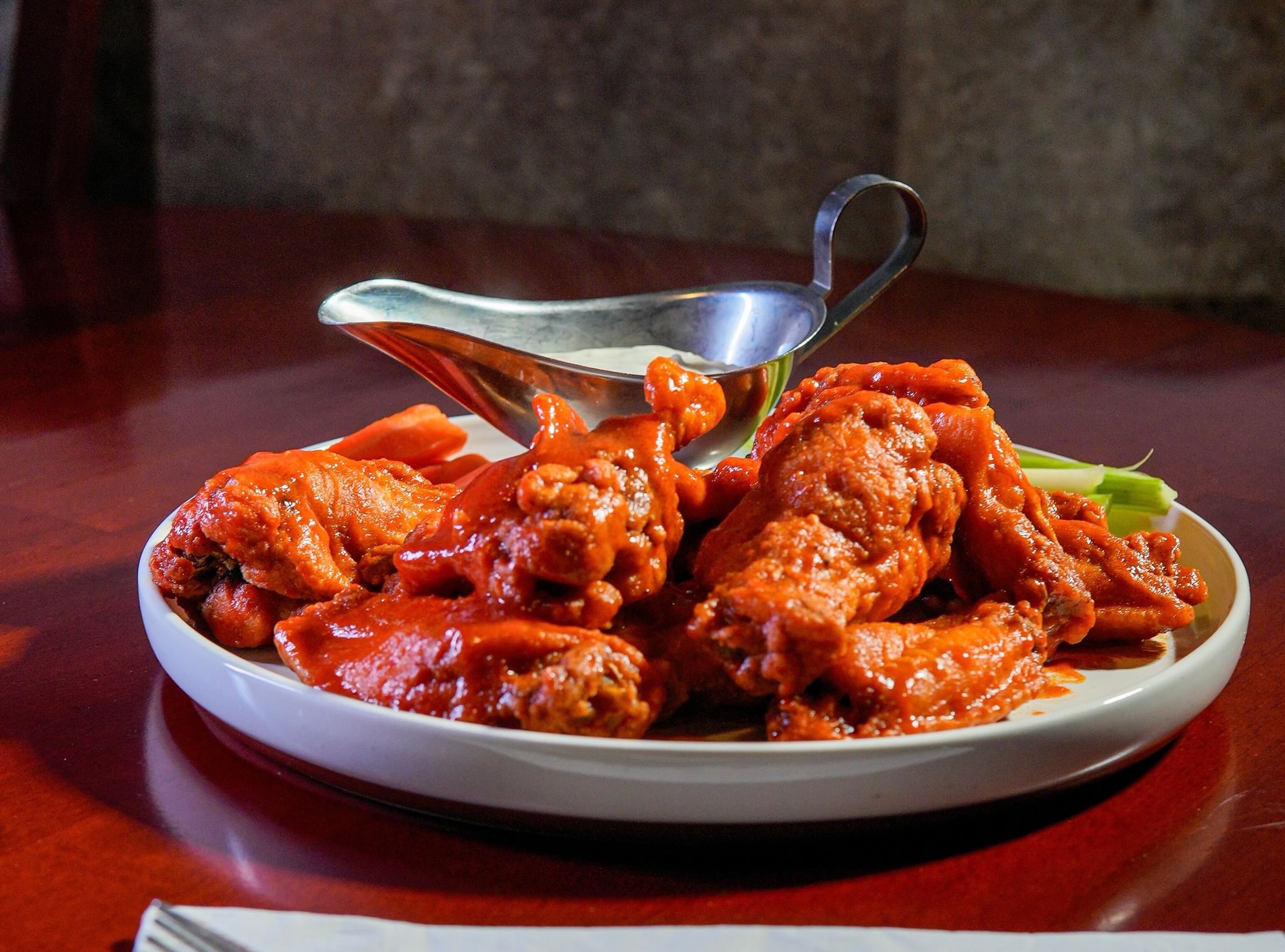 Mild, medium or hot. Served with blue cheese dressing, celery, and carrots