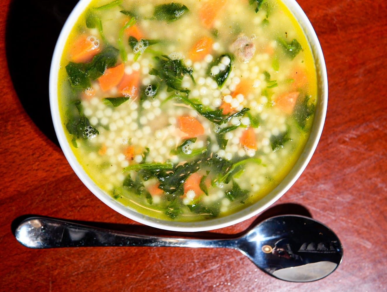 Angel hair pasta sauteed with shrimp, spinach and pignoli nuts in garlic and oil