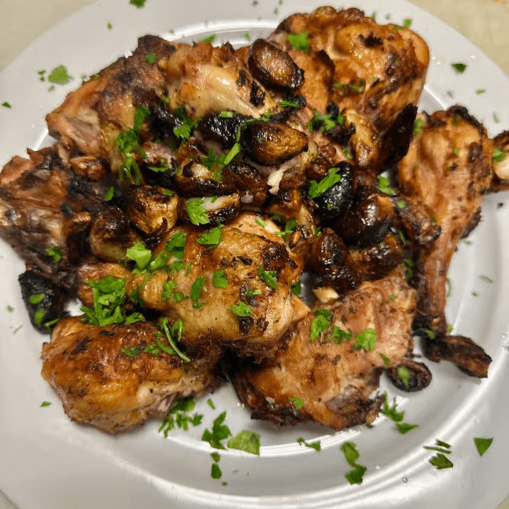 30 minutes to prepare. Pieces of chicken on the bone roasted with garlic. Also available with your choice of sausage, roasted peppers, broccoli, mushrooms, onions, or greens. Priced accordingly